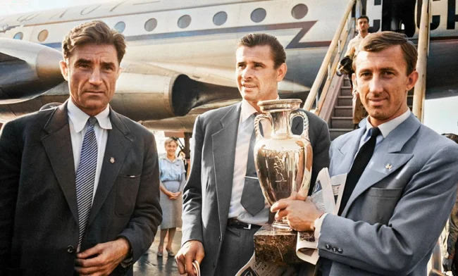 Гравці збірної СРСР Андрій Старостін, Лев Яшин та Ігор Нетто з Кубком Європи, 1960 рік.