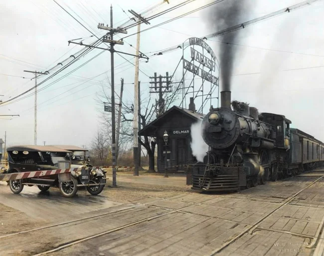 Поїзд відправляється зі станції Уобаш, Чикаго-Канзас-Сіті, Делмарі, 1923 рік.