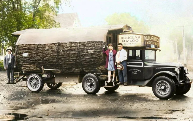 Мобільна зроблена з колод хатина на вантажівці, вирізана з одного великого видовбаного колоди. Сіетл, штат Вашингтон», 1920-ті роки.