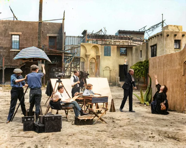 Світло, камера, двигун. Зйомка фільму на задньому дворі кіностудії у Голлівуді, 1920-ті.
