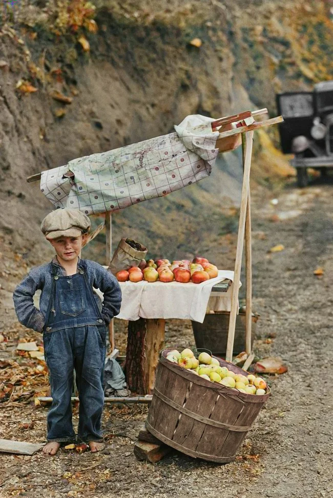Хлопчик продає яблука біля дороги в Північній Кароліні, близько 1934 року.