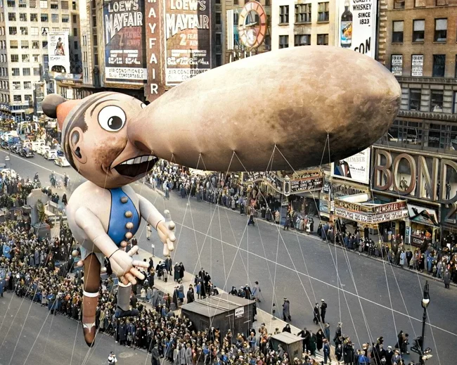 Гігантська надувна фігура «Піноккіо» з 13-го параду Macy's на честь Дня подяки у Нью-Йорку, 1937 рік.