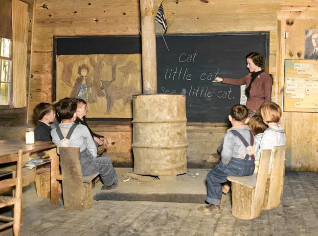 Однокласна школа під час Великої депресії. Алабама, США, 1937 рік. Це бідна сільська школа, бочка в центрі, якщо хтось не зрозумів - це буржуйка. На дошці малюнок вовка з Червоною шапочкою, а вчителька пише про маленьке кошеня. У такій школі урок прогуляти не вдасться.