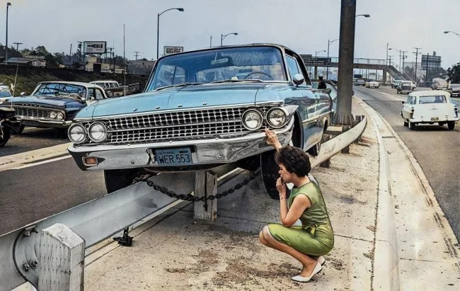 Міс Марта Сью МакКаун з Норуолка, оглядає пошкодження свого Ford Galaxy, на якому вона на великій швидкості заскочила на роздільну огорожу. США, 1962 рік.
