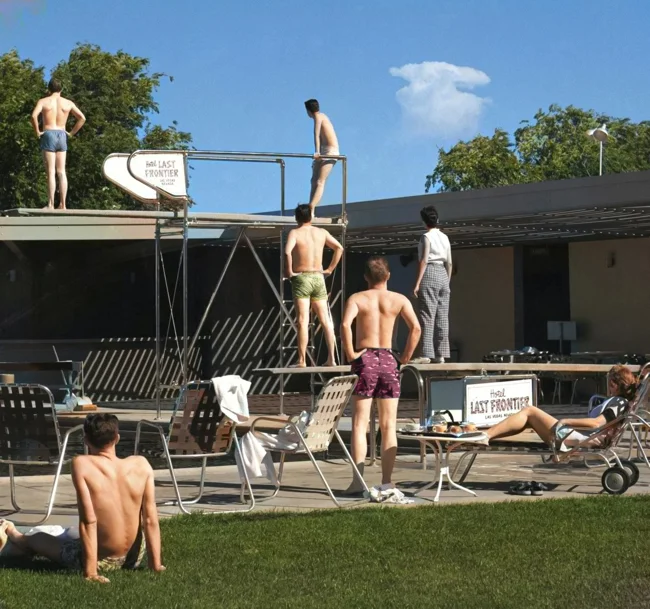 Майже всі роздягнені, обличчям до вибуху, щоб ядерна засмага легша. Та й готель з назвою "Останній рубіж", що говорить. Полігон розташований у США на півдні штату Невада в окрузі Най, всього в 105 км на північний захід від Лас-Вегаса. У 1950-і роки там часто проводили випробування ядерної бомби.