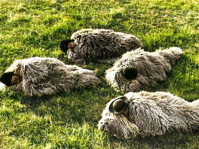 Пастухи сплять на траві під овечими шкурами, США, 1937 рік.