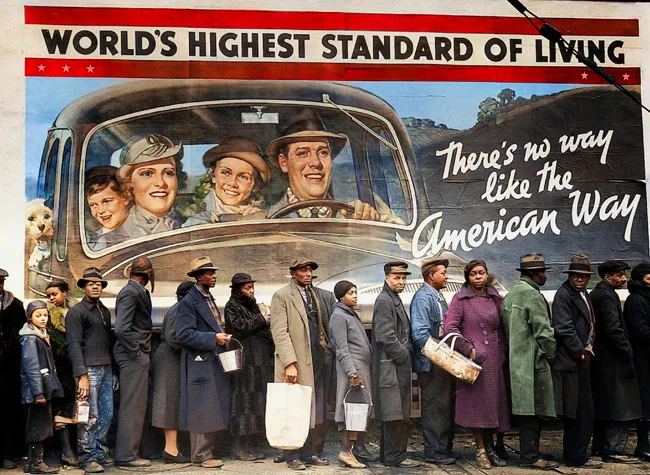 Я вважаю, що черга з небілих американців, бо у 30-ті через сегрегацію чорношкірих менше брали на роботу. Звичайно, весь низькосортний обслуговуючий сегмент був на них, але решта професій для білих. І якщо навіть білим важко було працевлаштуватися під час Великої депресії, то чорним тільки й залишалося, що в чергах простоювати за чимось безплатним.