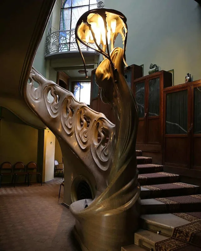 12. Головна сходи будинку С.П. Рябушинського (нині музей-квартира А.М.Горького) Москва. У комплекті із люстрою у формі медузи. Збудований у 1900-1902 роках архітектором Федором Шехтелем