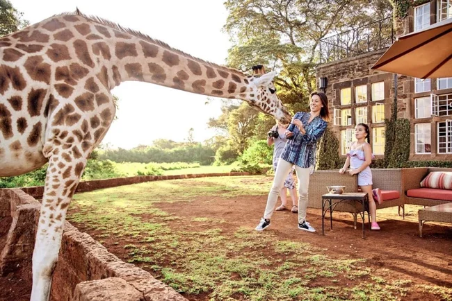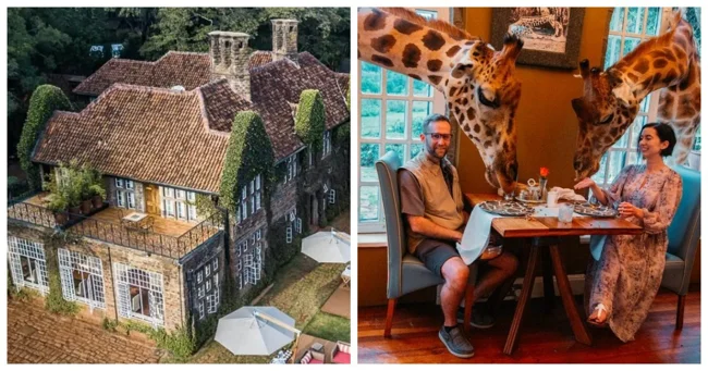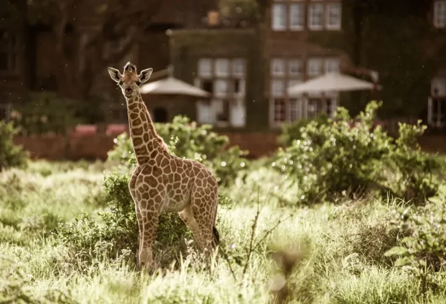 Плямисті миляги поглинають все, що лежить на тарілці, причому їх морди знаходяться поруч з обличчями постояльців готелю. Оскільки вони мають право необмеженого пересування, це відбувається виключно за їхнім бажанням. Закінчивши трапезу, вони висовують голови з величезних вікон Giraffe Manor і продовжують жити своїм звичайним життям.