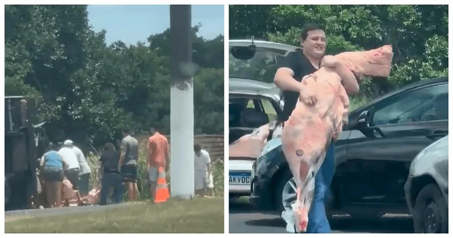 Мародери вкрали п'ять тонн м'яса з вантажівки, що перекинулася (2 фото + 1 відео)