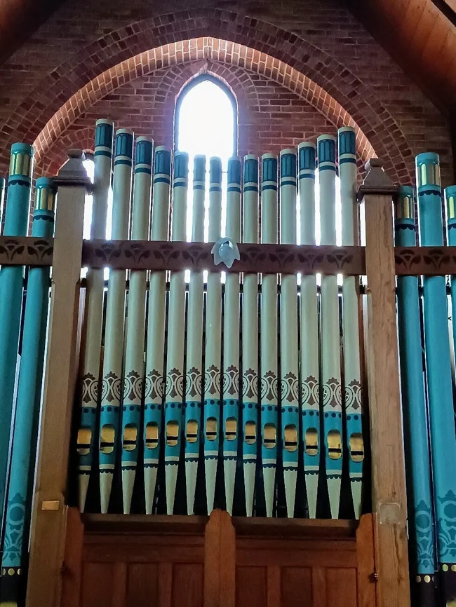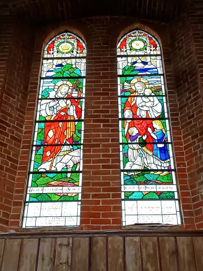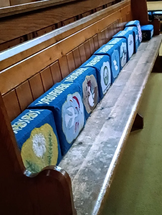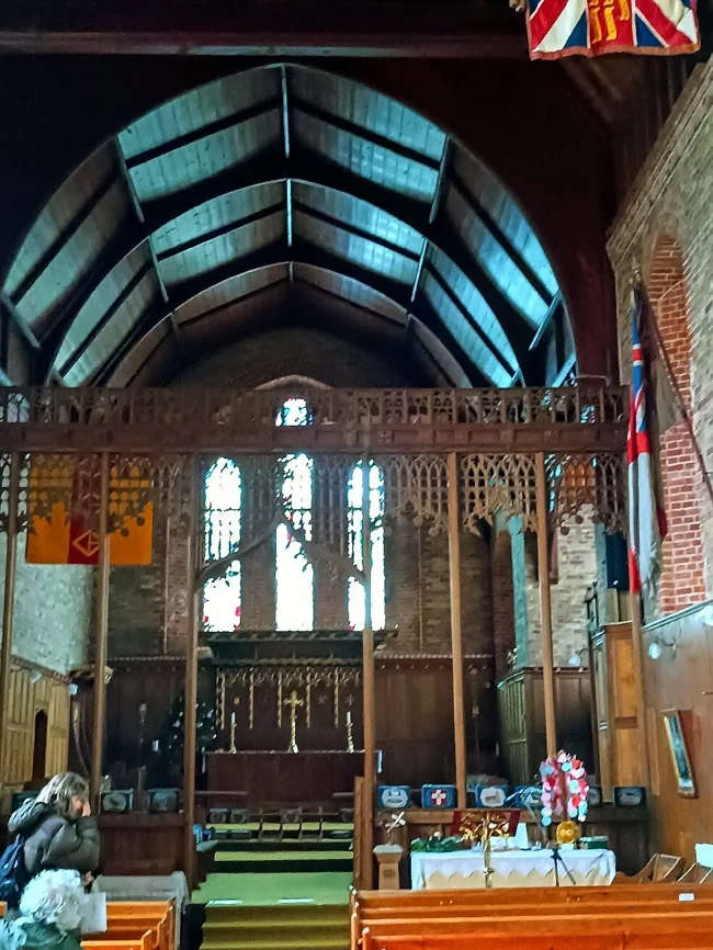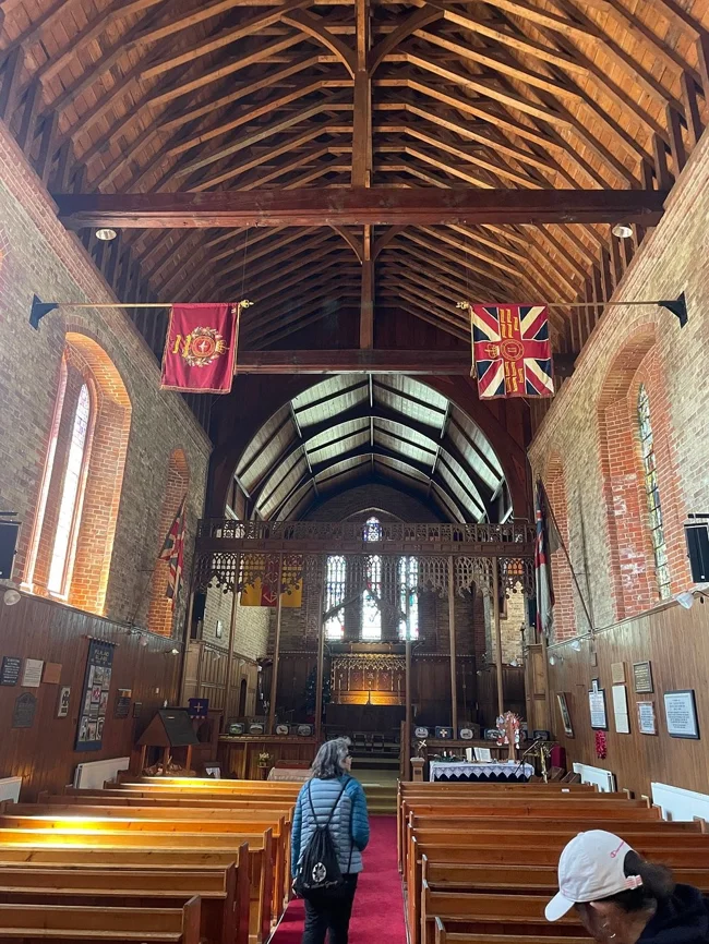 Усередині все також просто: дерев'яні лави, вітражі та 55 подушок, пошитих місцевими парафіянами та символізують різні аспекти Фолклендських островів. Однак серед звичайних речей, які можна знайти в церкві невеликого містечка, є один предмет, що становить особливий інтерес, - прапор Шеклтона. Сер Ернест Шеклтон був дослідником, якого британці запросили приїхати на Фолкленди і зробити кілька економічних пропозицій і до його поради прислухалися з великою увагою. Шеклтон був членом Ордену Підв'язки, найвидатнішого лицарського ордену.