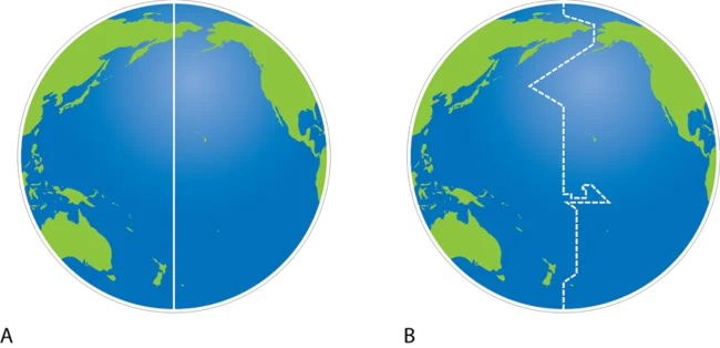 Лінія зміни дат. А - по 180 меридіану, В - існуюча.