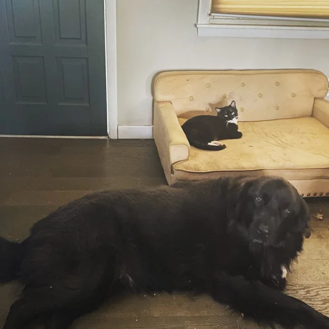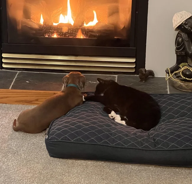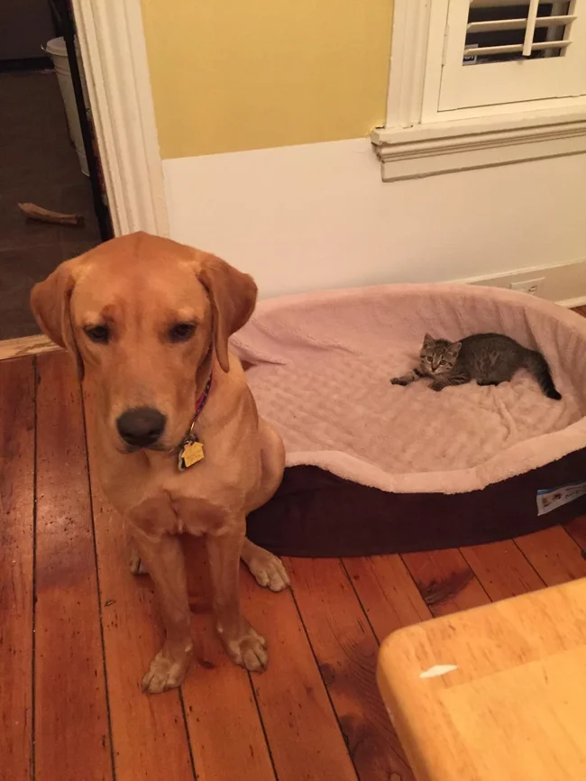 22. Мій милий лабрадор занадто сором'язливий, щоб прогнати кота, тому він просто сумно дивиться на своє законне місце біля каміна.