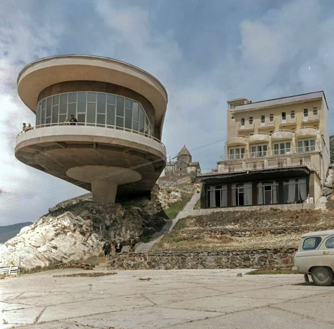 Будинок творчості письменників на озері Севан, Вірменія 1960-80-ті. Архітектура "Радянський модернізм з елементами футуристичної естетики". Чудовий витвір радянського модернізму, спроектований геніальним Геворгом Кочаром за дорученням Сталіна (після його смерті було збудовано). На сьогоднішній момент будівля занедбана, як і творчість, лише своїм напівзруйнованим виглядом нагадуючи про розвинену цивілізацію радянських людей, що існувала раніше.