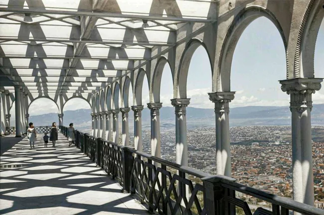Тбіліський фунікулер було відкрито 25 грудня 1958 року. Його будівництво розпочалось у рамках програми модернізації інфраструктури міста, щоб покращити доступ до історичних районів на пагорбах. Фунікулер замінив собою більш ранню систему підйому — канатну дорогу, яка була менш зручною та ефективною. На фото відкрита тераса верхньої станції фунікулера. Зараз тут знаходиться ресторан.