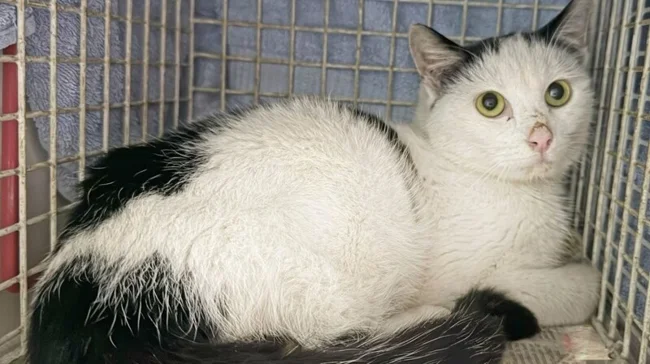 Білий кіт із чорними плямами налякано сидів у контейнері і не хотів до себе нікого підпускати. Коли співробітники почали його ловити, щоб передати до відповідного фонду для порятунку та медичного огляду, він спочатку тікав. Врешті-решт їм вдалося зловити пухнасту тварину, заманивши її в клітку з їжею.