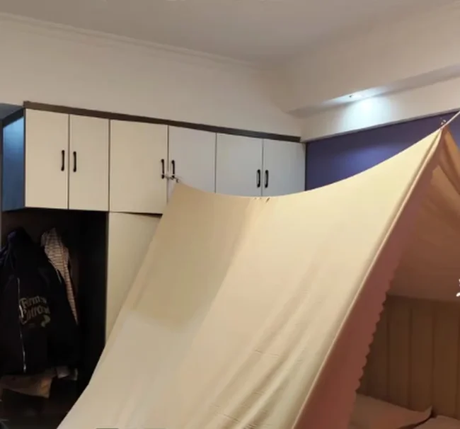 Вона пояснила, що її первісна ідея полягала в тому, щоб купити намет, який можна було б розмістити на ліжку під час подорожей. Однак вона відкинула цей варіант через високу вартість наметів та обмежений простір. ![]()