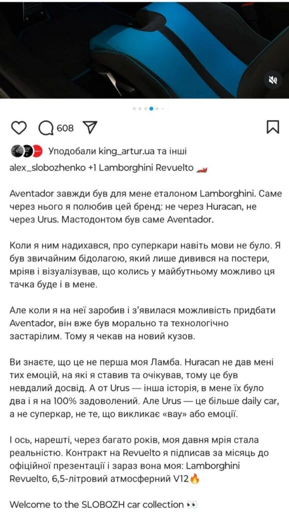 Слобоженко підписав контракт із Lamborghini ще до офіційної прем’єри Revuelto, коли модель навіть не мала назви. Як зазначив бізнесмен у своїх соцмережах, автомобіль налаштовували індивідуально під його побажання. За авто він приїхав до Варшави, де знаходиться представництво бренду.