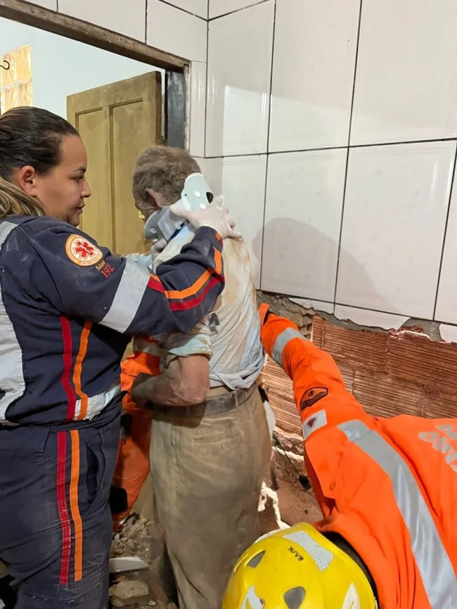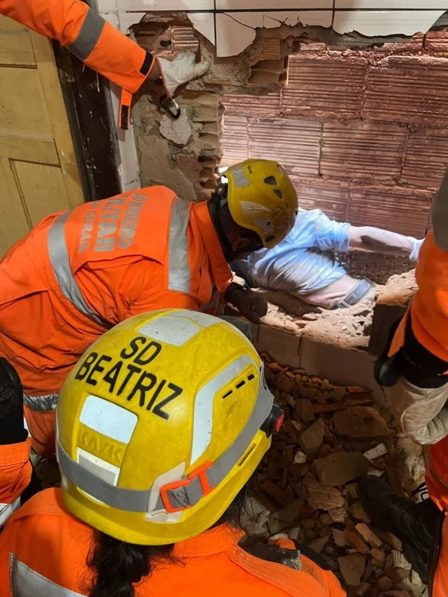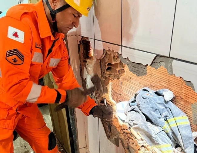 Старий житель Контагема (Бразилія) має намір врятувати курку, яка влізла у вузьку щілину між його будинком та сусіднім.