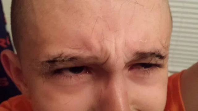 Мій син вирішив підстригти собі брови. Вийшло дуже коротко, тому він зрізав волосся з голови і приклеїв його на брови. І відразу зрозумів, що так робити не варто.