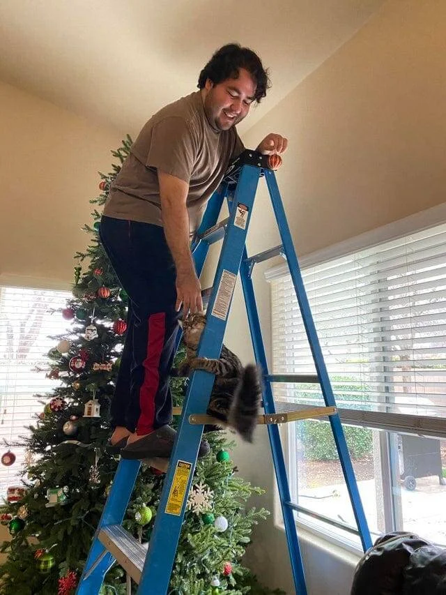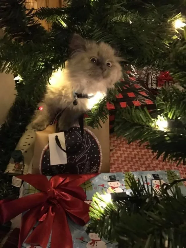 Кішка залізла на ялинку, впала з неї і впала прямо в подарунковий пакет