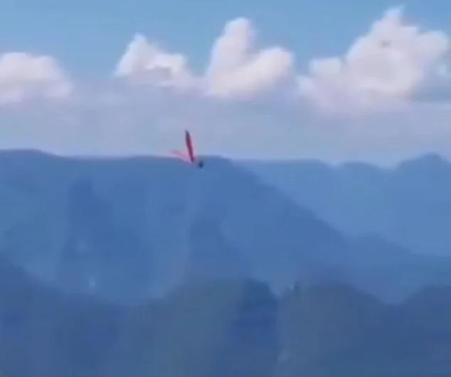 На опублікованому ролику бразилець ковзає повітрям над мальовничими гірськими пейзажами, приблизно через півхвилини його планер складається навпіл, і він починає стрімко падати.