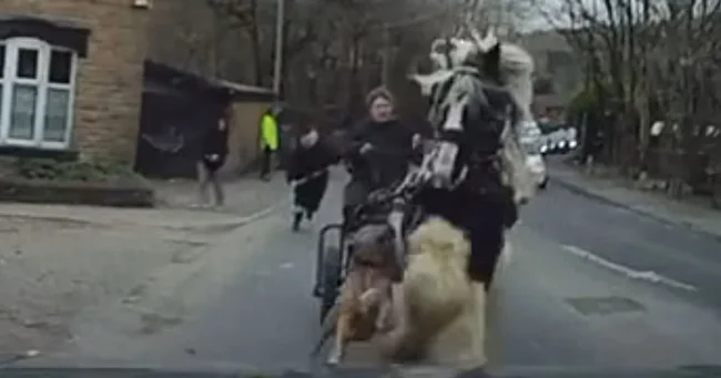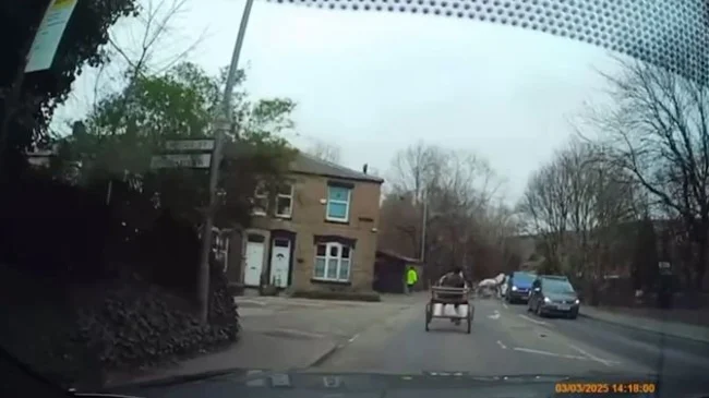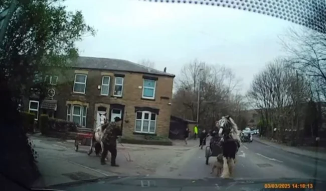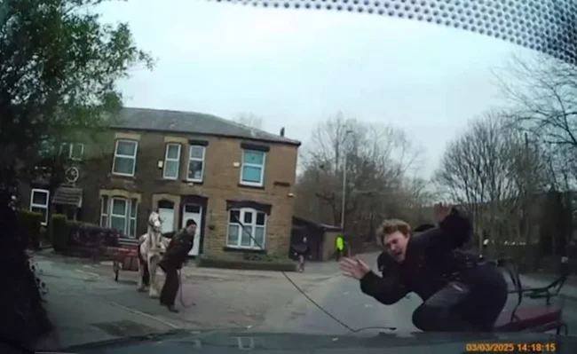 Минулого понеділка на одній із вулиць Олдема, Великий Манчестер, собака бійцівської породи вибіг на проїжджу частину і кинувся на коней. Злякані тварини помчали прямо на зустрічний транспорт, поводи випали у чоловіка з рук, і він упав на капот автомобіля.