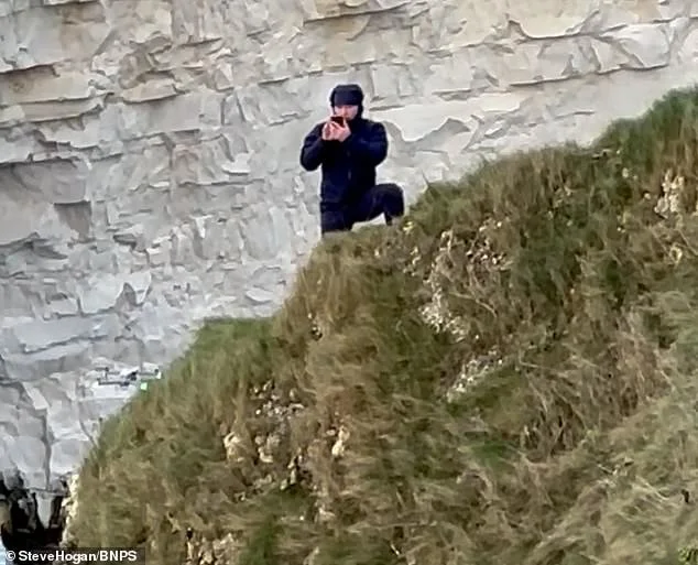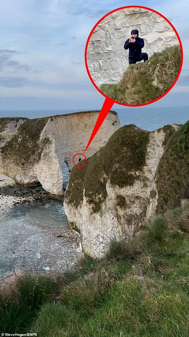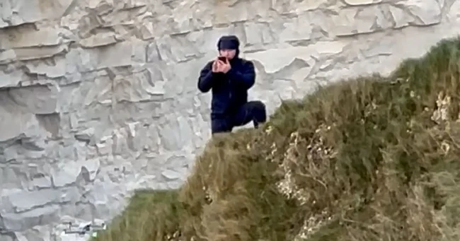 На кадрах сміливець спускається виступом, а по обидва боки від нього — прірва і неминуча загибель. Після чого дістає телефон і робить селфі на тлі моря. Благо, його прогулянка щасливо закінчилася.
