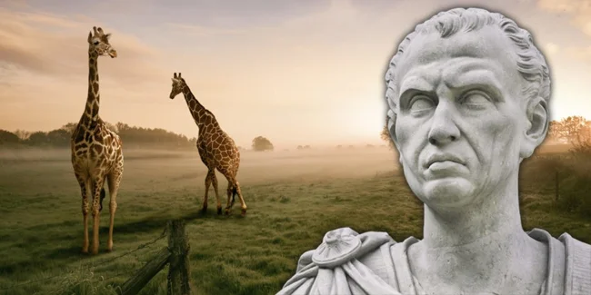 Найцікавішим із них була дивна істота з довгою шиєю, наполовину верблюд, наполовину леопард (в уявленні римлян) – жираф. Побачивши його покірність, римський історик Пліній припустив, що це, можливо, «дика вівця». Але самого Цезаря мало цікавила видова приналежність дивного творення. Він згодував жирафа левам у своєму Колізеї на очах у радісної публіки на знак свого багатства та великодушності.