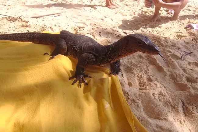 Мавпи бігають пляжем і тягнуть їжу, яка погано лежить. Крім того, хвостаті пройдисвіти потрошать сумки, рюкзаки та пакети зі сміттям у пошуках їстівного. А вже після них варани, вальяжно переставляючи пазурі лапи, не поспішаючи повзають між пляжними підстилками, та й прямо по них, і стріляють туди-сюди своїм довгим роздвоєним язиком, вишукуючи в піску те, що впустили або недоїли мавпи. Ну і жалісливі відпочиваючі іноді провіанту підкинуть.