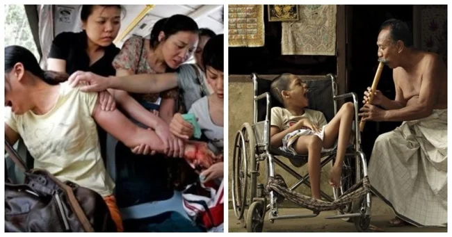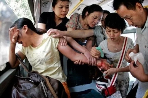 13. Пасажири громадського автобуса намагаються врятувати жінку, яка намагалася накласти на себе руки, перерізавши собі зап'ястя ножем для фруктів. ![]()