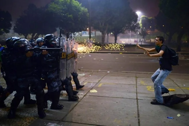 2. Бразильський демонстрант перед поліцейським вогнем під час протесту проти корупції та зловживань з боку поліції