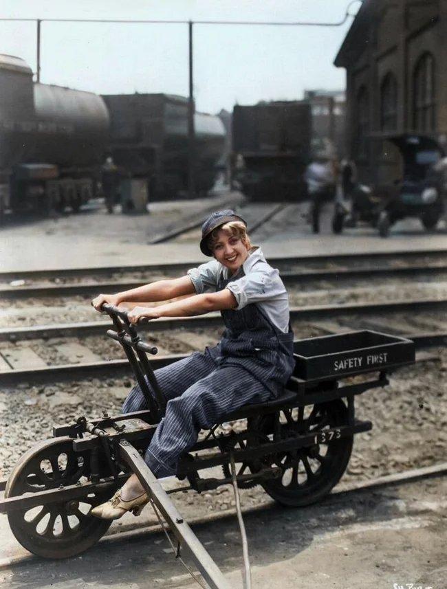 Актриса Джоан Блонделл їде залізницею, під час зйомок фільму, 1931 рік.