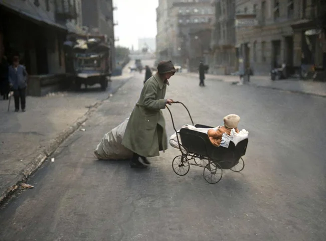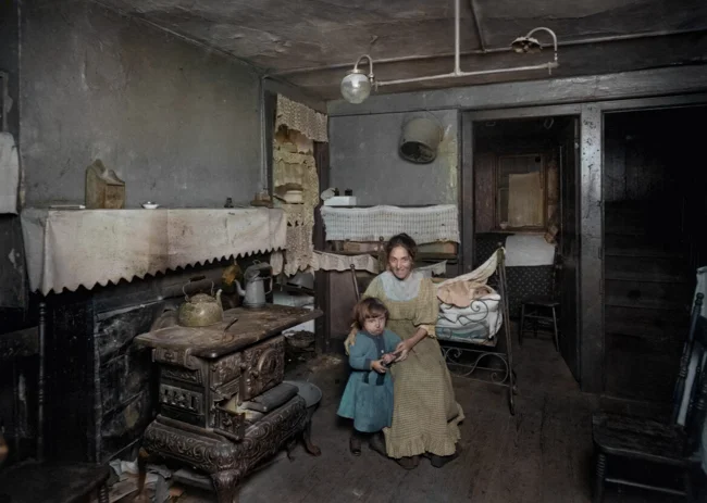 Портрет іммігрантки позують поруч з піччю разом зі своєю дитиною в трущобном багатоквартирному будинку, Нью-Йорк, 1911 рік.