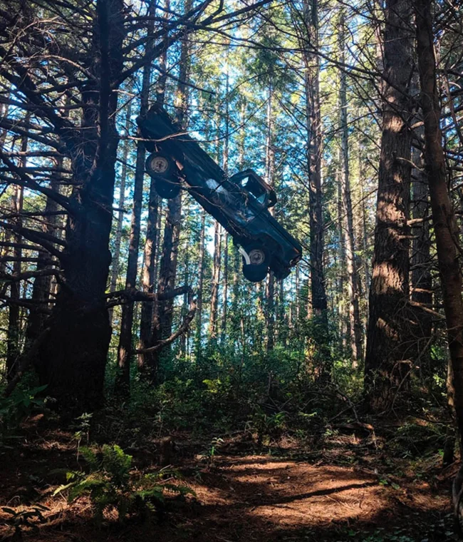 Як машина застрягла у гілках дерев, складно уявити. Найближча дорога знаходиться за кілька миль від цього місця