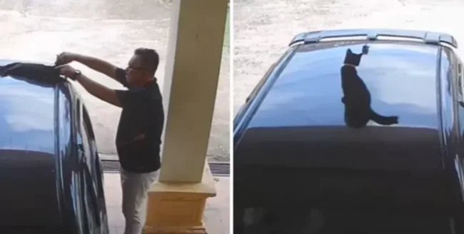 Чоловік сів у машину та поїхав, а вже в дорозі побачив на даху свого кота (1 фото + 2 відео)