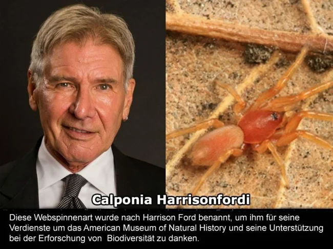 На честь актора Харрісона Форда названі види павуків (Calponia harrisonfordi) та мурах (Pheidole harrisonfordi). Голлівудська зірка була удостоєна такої честі завдяки самовідданій роботі зі збереження природи.