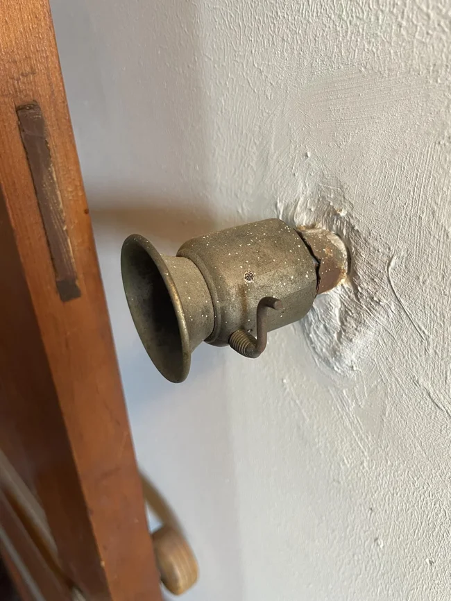 1. Невеликий металевий циліндр у стіні будинку XIX століття з маленьким важелем та заслінкою.