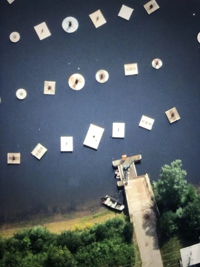 5. Великі квадратні та круглі предмети, що плавають у воді біля електростанції