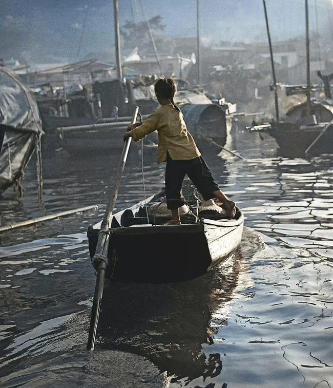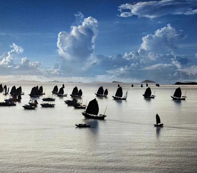 На цьому знімку зафіксовані рибалки на човнах-джонках, які рано-вранці виходять у море під нічний бриз, що дме з суші. Човен у правому нижньому кутку йде бакштагом - це означає, що вітер направлений у корму, а вітрило стоїть перпендикулярно йому. Про це свідчить чітко видно кільватерний слід. А ось днем все змінюється: з'являється морський бриз, що вже дме з моря на берег, і на ньому рибалки повертаються додому. Такі щоденні переходи — це не просто спосіб пересування, а ціле явище природи та людської гармонії з нею.