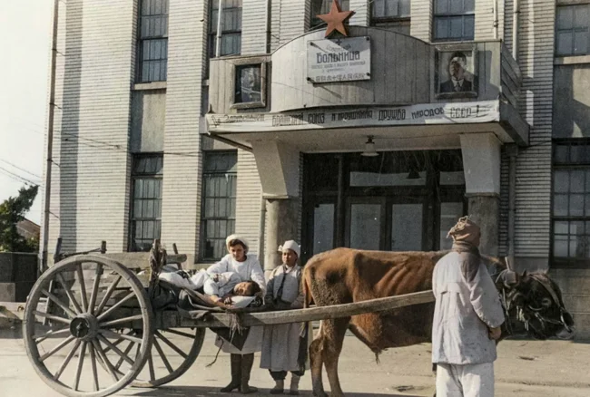 Пацієнт прибуває на візку, запряженому волами, до радянської лікарні в Чиннампо, Північна Корея, травень 1947 року.