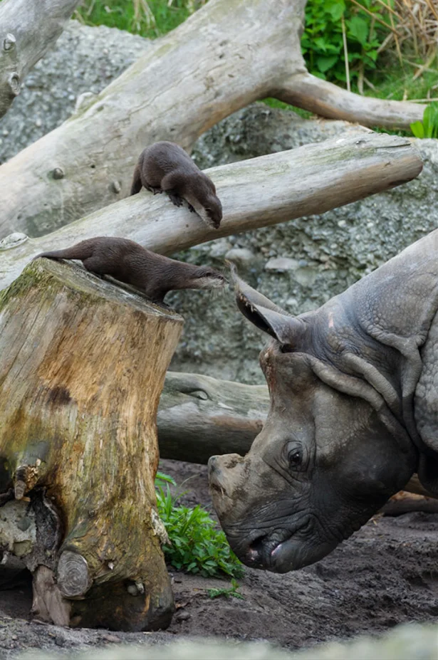 У Базельському зоопарку, Швейцарія, безкоготні видри живуть в одному вольєрі з індійським носорогом. І ніхто нікого не чіпає!