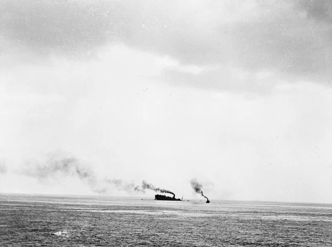 Під час чергового німецького нальоту о 13:50 бомбою в місток було пошкоджено інший крупний транспорт, SS Oronsay (тоннаж 20043 брт). "Ланкастрія" цілком могла вільно відплисти самостійно, до того ж командир есмінця HMS Havelock порадив Шарпу так і вчинити. Але той турбувався, що поодинці може стати жертвою підводних човнів. Шарп вирішив дочекатися ремонту SS Oronsay, з яким вийшов би і есмінець прикриття.
