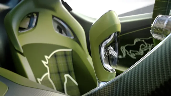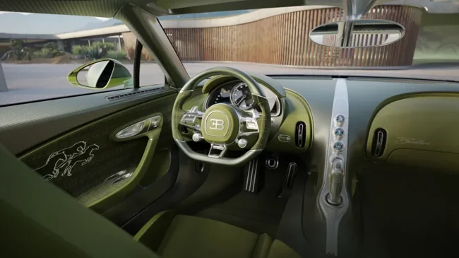 Назва Brouillard відсилає до імені коханого скакового коня Етторе Бугатті. Відповідно оформлений інтер'єр гіперкара: силуети коней вишиті на дверних картах, а в алюмінієвий селектор трансмісії вбудований скляний елемент із встановленою всередині тематичною статуеткою. Салон оздоблений зеленою шкірою та карбоном, картата тканина для гіперкара спеціально виткана в Парижі. Крісла виготовлені з урахуванням будови тіла замовника Brouillard – власника найбільшої колекції Bugatti у світі голландця Мішеля Перрідона.
