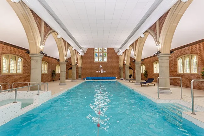 У британському Сурреї покинута вікторіанська церква ХІХ століття знайшла нове життя як розкішний критий басейн, де склепінні стелі відбиваються в бірюзовій воді.
