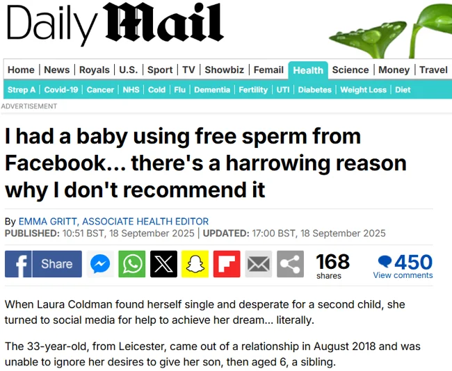 Все почалося з історії 33-річної Лори Колдман з Лестершира, офіцера зв'язку, який після розлучення вирішив завести другу дитину. Не знайшовши партнера, вона звернулася до груп у Facebook, де чоловіки пропонували свою сперму безкоштовно. Такі групи існують уже кілька років, і багато жінок бачать у них спосіб уникнути дорогих процедур на зразок ЕКО, які коштують тисячі фунтів.