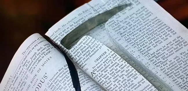 Але відкривши її, він виявляє, що сторінки вирізані — і там, де має бути священний текст, лежить молоток.