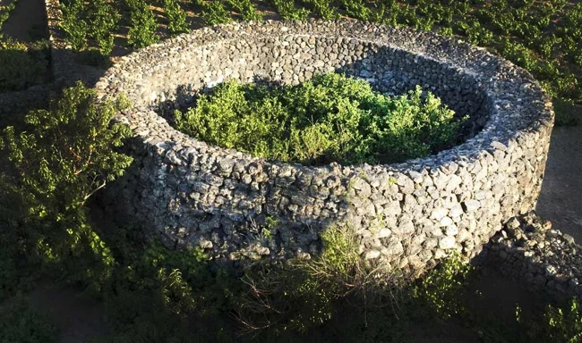 Лозу ретельно обрізають, змушуючи її стелитись по землі густим кущем, а не тягнутися вгору. Заглиблення постійно підправляють, створюючи для винограду ідеальні умови. А наприкінці липня, під час майже ритуального дійства, урожай збирають уручну. Цікаво, що подібну техніку можна зустріти іншому вітряному вулканічному острові Лансароте в Атлантиці.