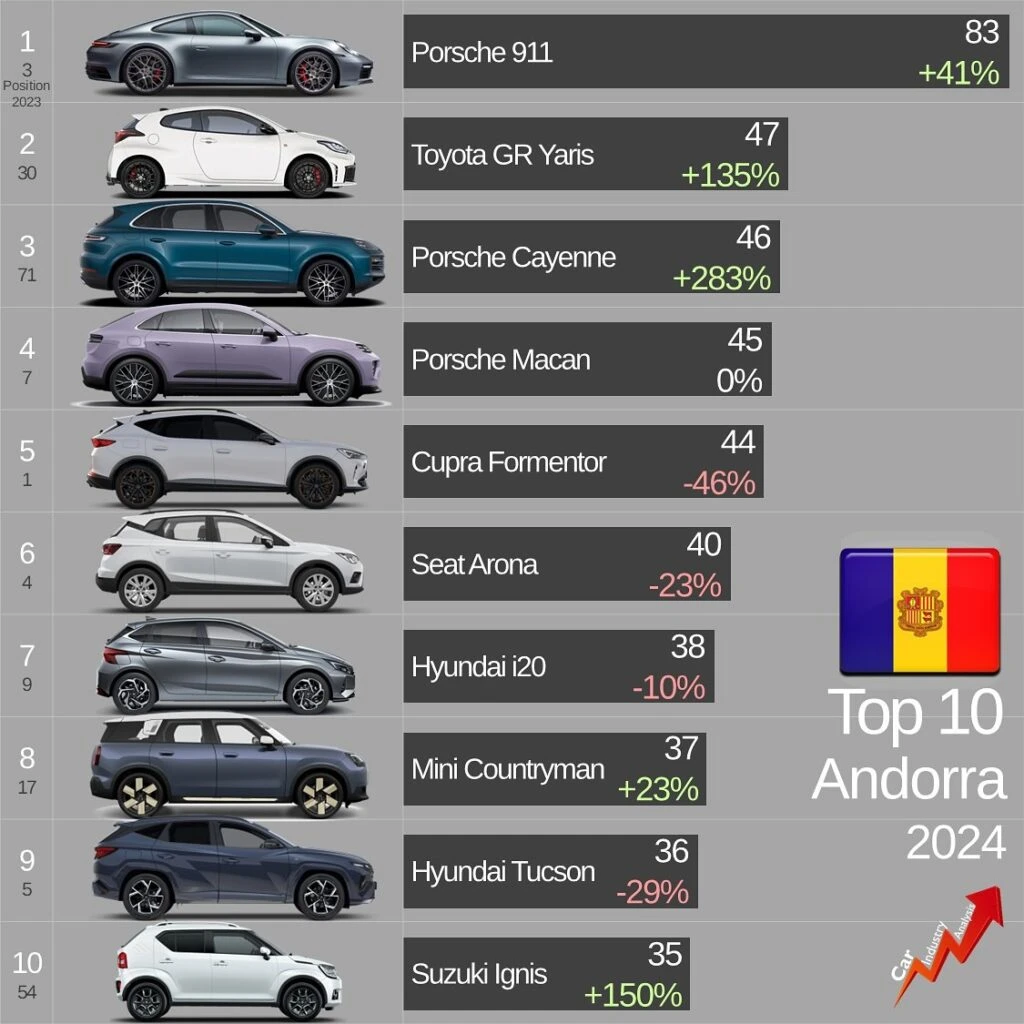 Серед найцікавіших відкриттів дослідження – модель Porsche 911, яка стала найпопулярнішим автомобілем у Андоррі. Це яскраво відображає високий рівень доходів у цій невеликій країні, розташованій між Францією та Іспанією. Незважаючи на те, що площа Андорри становить лише 181 квадратну милю, а населення – близько 82 тисяч осіб, Porsche вдалося продати 83 одиниці моделі 911.