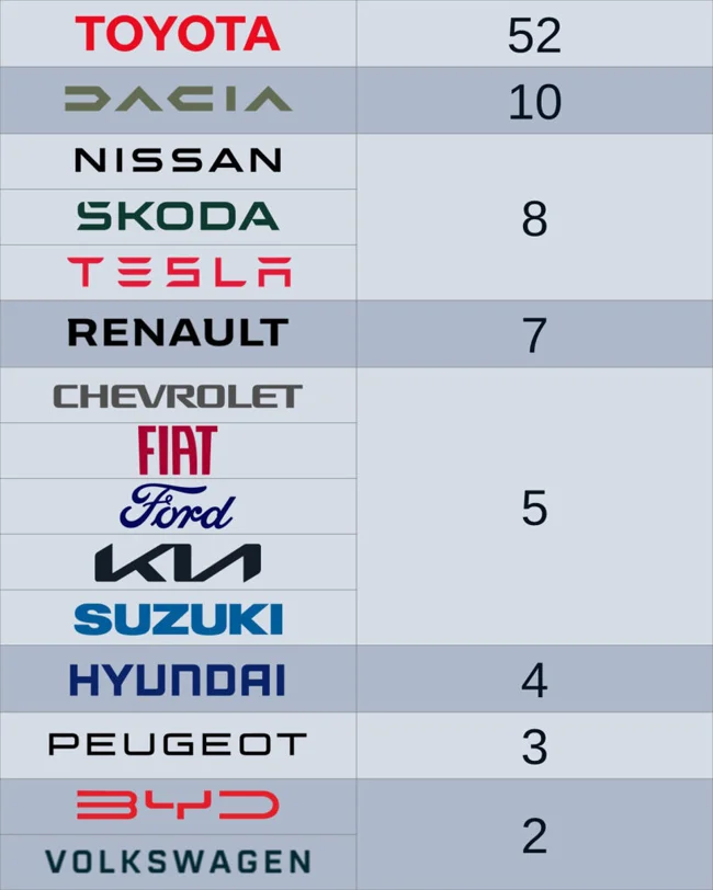 Друге місце посів Toyota, але не звичайна модель, а потужний GR Yaris, тоді як Porsche Cayenne та Macan завершили четвірку лідерів.